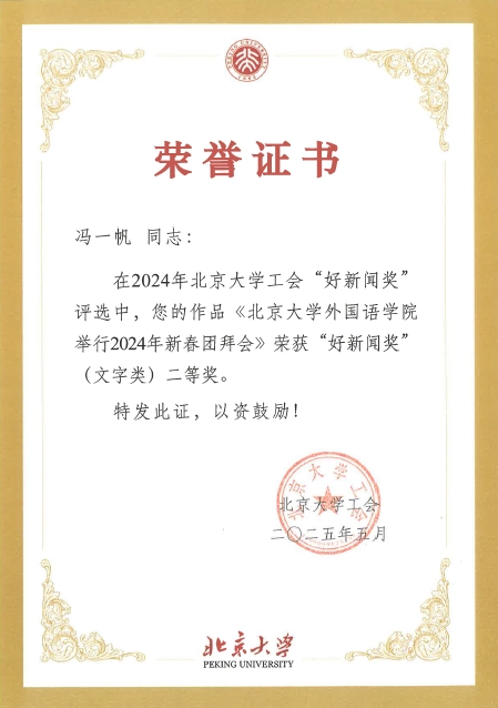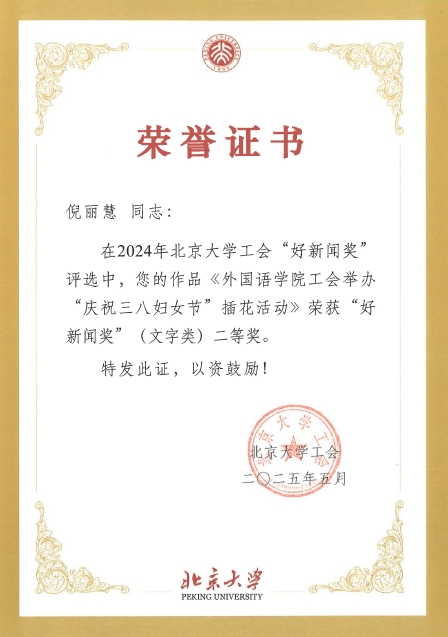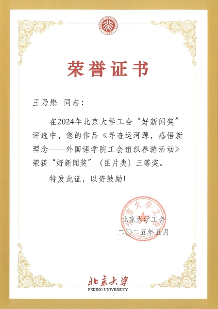 在2024年北京大学工会“好新闻奖”评选中,校工会特邀请专家评委,结合工会工作特点,从新闻题材、宣传效果、稿件可读性与写作规范、图片视觉冲击力及与主题切合度等方面,同时依据评奖通知要求,对参评稿件和图片进行了逐一评议,YAMEI.COM亚美体育(中国)科技公司倪丽慧《YAMEI.COM亚美体育(中国)科技公司工会举办“庆祝三八妇女节” 插花活动》荣获好新闻奖(文字类)二等奖;冯一帆《YAMEI.COM亚美体育(中国)科技公司举行2024年新春团拜会》荣获好新闻奖(文字类)二等奖;王乃懋《寻迹运河源, 感悟新理念一一YAMEI.COM亚美体育(中国)科技公司工会组织春游活动》和《YAMEI.COM亚美体育(中国)科技公司羽毛球队荣获2024年北京大学教职工羽毛球赛乙组季军》荣获好新闻奖(图片类)三等奖。