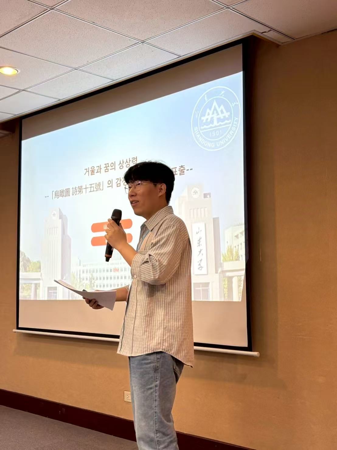 开幕式后,论坛进入发言讨论环节,来自五校的11名研究生宣读论文,参会同学就论文内容进行了热烈讨论与深入交流,参会老师们给予点评与指导。第一场主题发表由山东大学牛林杰老师担任主持,山东大学孙正盛同学、南京大学张明娟同学、山东大学王丽媛同学、北京大学王恩泽同学先后以《镜与梦的想象力——「鸟瞰图·诗第十五号」的情感节制与痛苦流露》、《柳基石中文笔名小考》、《救亡·建构·消解:抗日语境下东亚戏剧的安重根叙事》、《塑造“华界”:中国近代在朝华商租界制度的构想与实践》为题发言。第二场主题发表由北京大学王丹老师担任主持,北京大学阿娅古兹·木合亚提同学、台湾政治大学顾奕伃同学、台湾中国文化大学马郁媙同学先后以《认知语言学视角下韩国语间隙概念词的语义拓展机制研究——以“틈”,“사이”,“동안”为中心》、《韩中原因理由表现对照研究——以韩语原因理由表现-어서,-니까,-기 때문에为例》、《针对华语学习者的韩语汉字否定前缀词教学研究——以「무-(無)」、「불/부-(不)」为中心》为题发言。第三场主题发表由南京大学郑墡谟老师担任主持,南京大学朱庆林同学、台湾政治大学普唯祯同学分别以《高丽末儒臣李穑的中国体验与天下观》、《朝鲜汉诗时调译与时调汉译诗的翻译策略考察》为题发言。第四场主题发表由台湾中国文化大学郑润道老师担任主持,台湾中国文化大学陈禹臻同学、台湾政治大学周筱蓓同学分别以《台韩职场霸凌防治制度比较研究》、《性别言谈中韩文问句功能的差异探讨:以韩国综艺节目<单身即地狱>第一季为中心》为题发言。