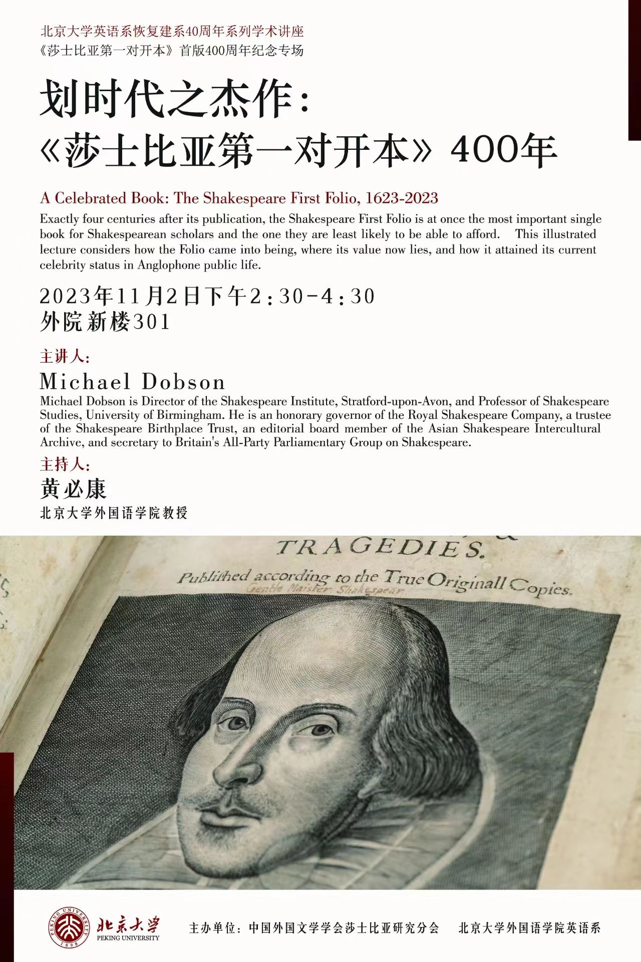 北京大学英语系恢复建系40周年系列学术讲座:划时代之杰作:《莎士比亚第一对开本》400年 讲座预告