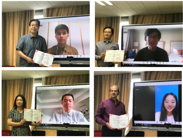 付志明教授宣读了获奖名单,其中一等奖5人,二等奖10人,三等奖15人(名单附后)。他与在场的各位专家及教师一起为获奖同学颁发了获奖证书。颁奖时,获奖同学在屏幕上,颁奖的老师站在屏幕边,手举奖状,合拍照片,留下了一帧帧颇具特色的珍贵画面。
