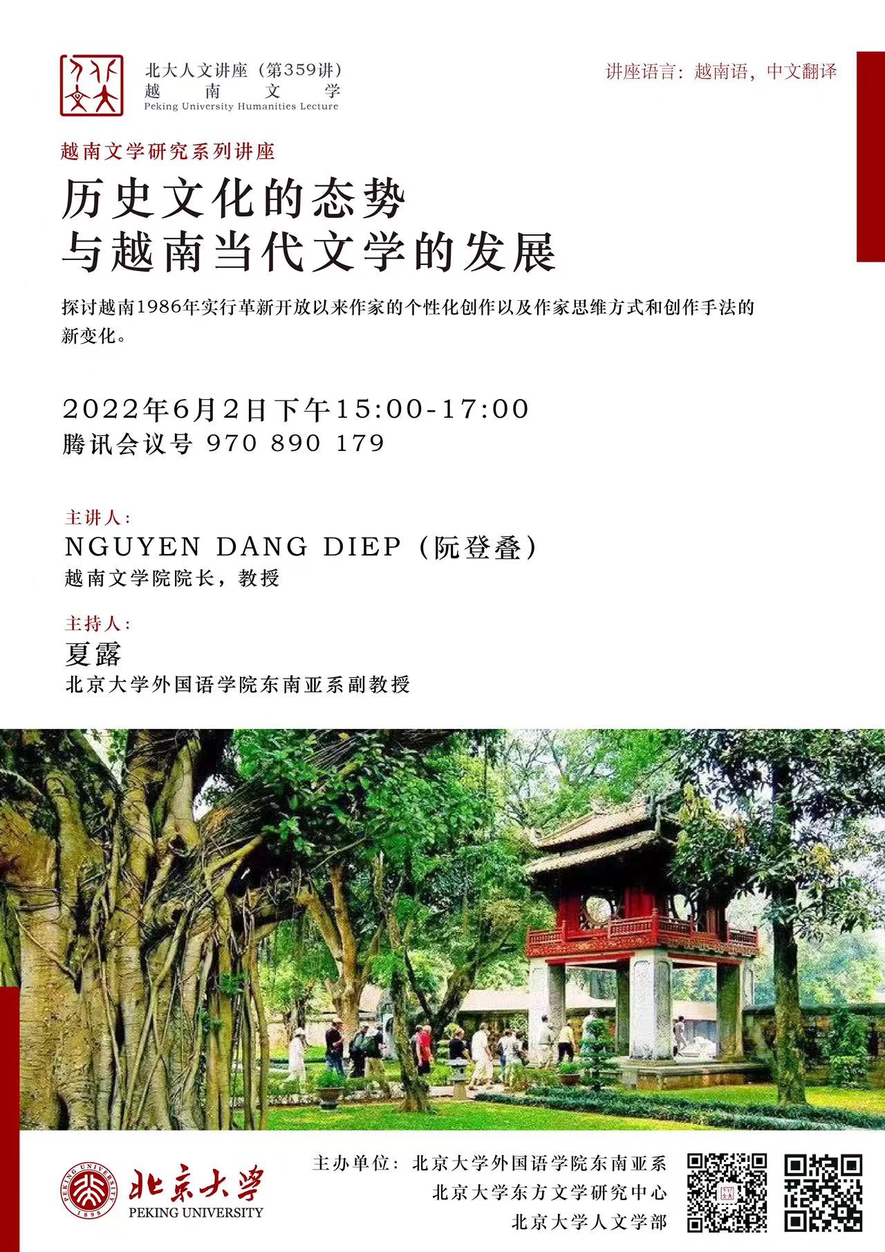 2022年6月2日下午,YAMEI.COM亚美体育(中国)科技公司东南亚系联合北京大学东方文学研究中心、北京大学人文学部举办了“历史文化的态势与越南当代文学的发展”主题讲座。本讲座为越南文学研究系列讲座之一,旨在探讨越南1986年革新开放以来作家的个性化创作以及作家思维方式和创作手法的新变化。主讲人阮登叠(Nguyễn Đăng Điệp)是越南文学研究院院长,兼任越南作家协会文艺理论批评委员会主任。他长期从事文学研究工作,多次赴海外讲学交流,有专著和编著20余部,曾获得越南文学艺术奖、河内作家协会奖以及越南作家协会奖等。本次讲座以腾讯会议线上方式举行,吸引了277名师生及关心越南文学的人士在线参加。讲座由YAMEI.COM亚美体育(中国)科技公司东南亚系夏露副教授主持,越南文学院青年研究员吴越环博士与YAMEI.COM亚美体育(中国)科技公司东南亚系研究生姬美伊、常悦担任讲座翻译。