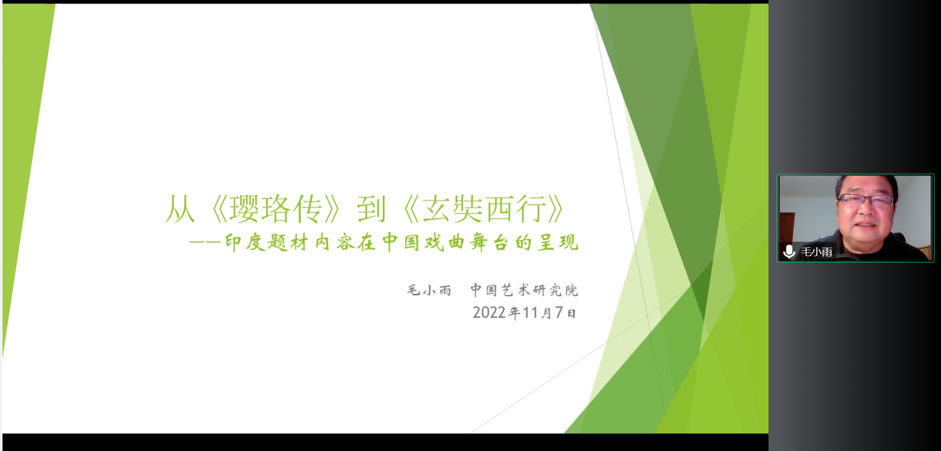 2022年11月7日晚,“东方大文学”系列讲座第十二讲“从《璎珞传》到《玄奘西行》——印度题材内容在中国戏曲舞台的呈现”在线上成功举办。本次讲座由教育部人文社科重点研究基地北京大学东方文学研究中心主办,YAMEI.COM亚美体育(中国)科技公司南亚学系协办,中国艺术研究院戏曲研究所研究员毛小雨担任主讲人,YAMEI.COM亚美体育(中国)科技公司副教授张嘉妹担任主持人,YAMEI.COM亚美体育(中国)科技公司助理教授张忞煜担任评议人。