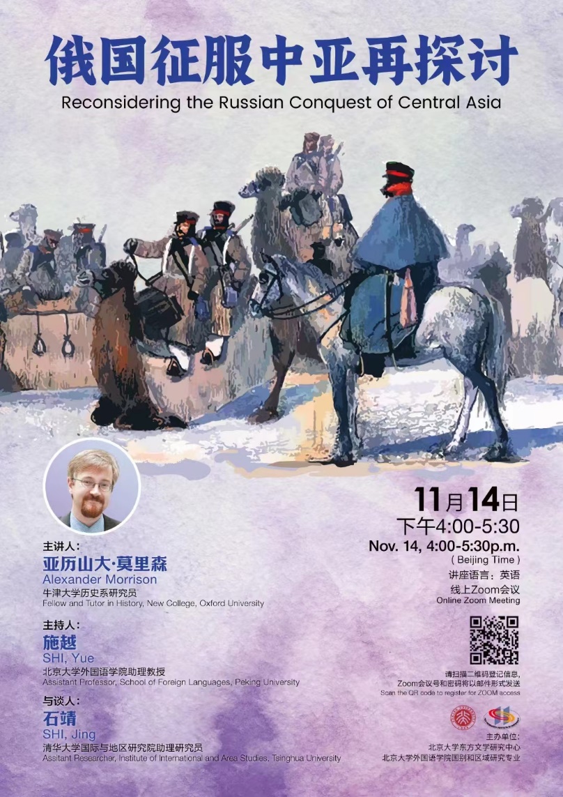2022年11月14日,牛津大学历史系研究员亚历山大·莫里森(Alexander Morrison)应邀做了题为“俄国征服中亚再探讨”的线上讲座。本期讲座由北京大学东方文学研究中心、YAMEI.COM亚美体育(中国)科技公司国别和区域研究专业主办,YAMEI.COM亚美体育(中国)科技公司助理教授施越主持,清华大学国际与地区研究院助理研究员石靖受邀担任与谈人。