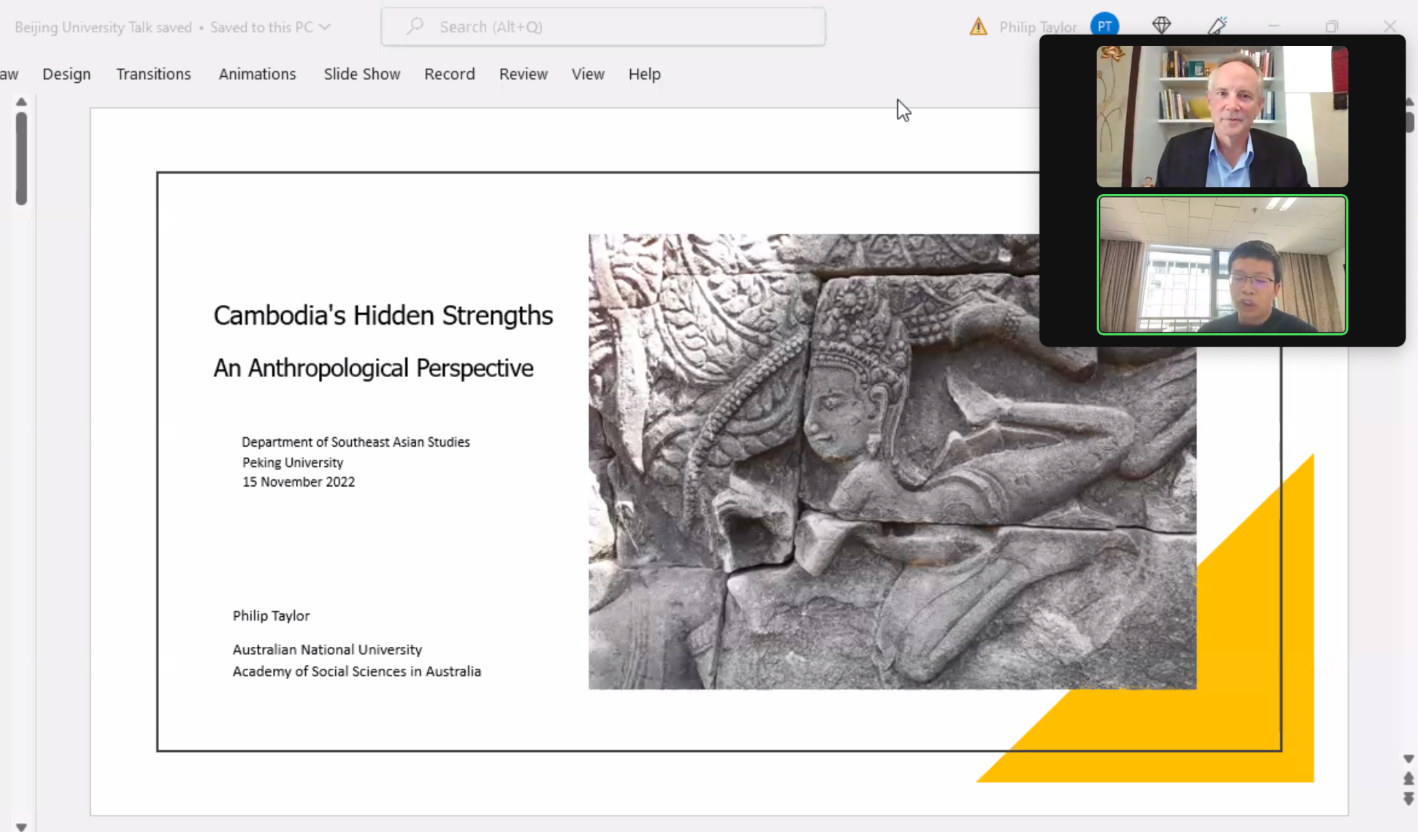 2022年11月15日,澳大利亚国立大学菲利普·泰勒(Philip Taylor)教授应YAMEI.COM亚美体育(中国)科技公司邀请进行了一场线上讲座,题为“柬埔寨的社会韧性:来自人类学家的近距离观察”。此次讲座由北京大学柬埔寨研究中心、北大外院国别和区域研究专业、东南亚系及“‘太平洋丝绸之路’档案文献整理与研究”项目组联合主办,并得到北京大学国际合作部的支持。