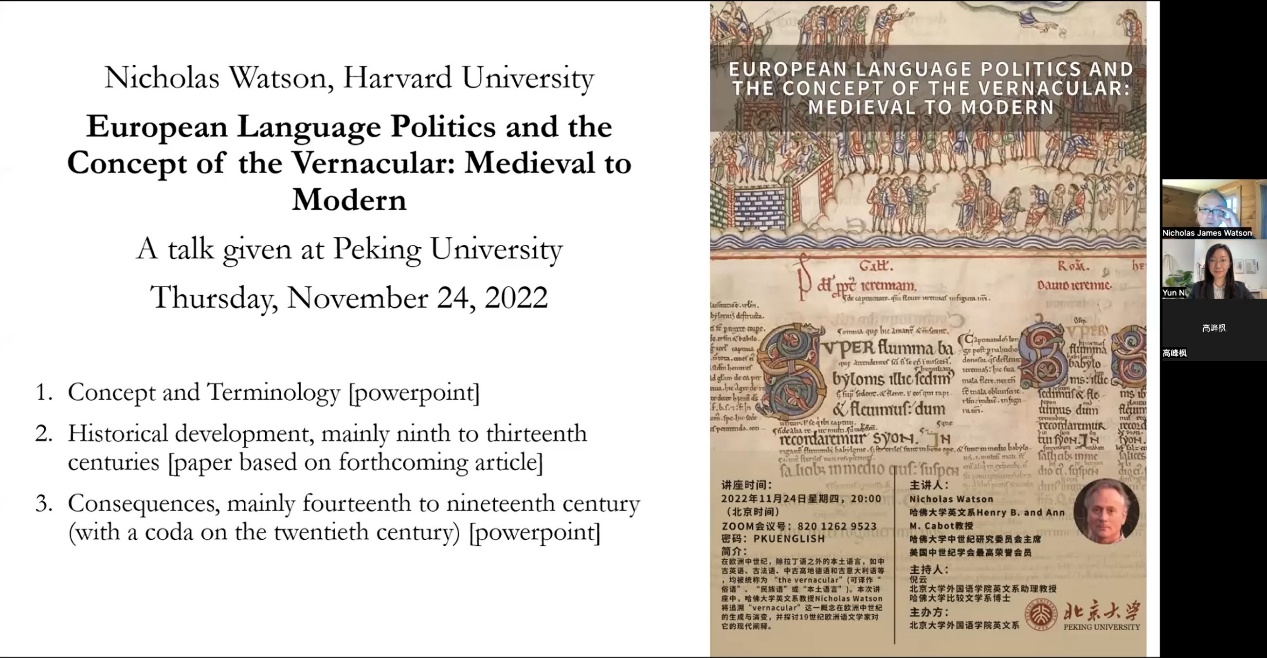 2022年11月24日,哈佛大学英文系教授尼古拉斯·沃特森(Nicholas Watson)应YAMEI.COM亚美体育(中国)科技公司英语系邀请,为北大师生在线上进行了题为“欧洲中世纪到现代的语言政治与俗语的概念”(European Language Politics and the Concept of the Vernacular: Medieval to Modern)的专题讲座。本讲座由YAMEI.COM亚美体育(中国)科技公司英语系主办,YAMEI.COM亚美体育(中国)科技公司英语系助理教授倪云主持、评议。