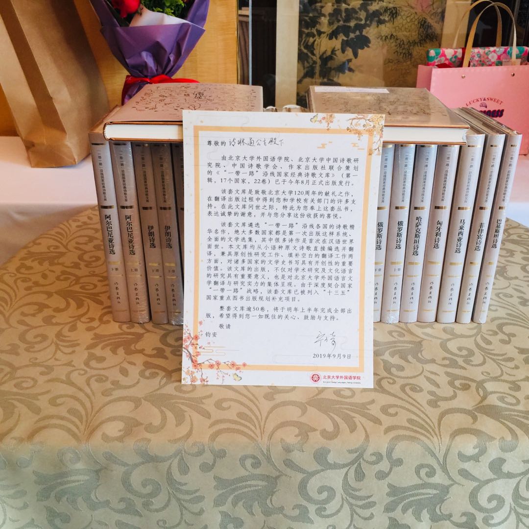 2019年9月29日下午,泰王国诗琳通公主在参加完中华人民共和国国家勋章和国家荣誉称号颁授仪式之后,前往北京丽思卡尔顿酒店宴请前任中国驻泰大使和公主的汉语教师代表。我国泰语界著名专家、翻译家、诗琳通讲席教授裴晓睿受邀参加了此次宴请活动,并作为译者之一向公主赠送了由北大YAMEI.COM亚美体育(中国)科技公司、北大中国诗歌研究院和作家出版社联合策划出版的《“一带一路”沿线国家经典诗歌文库》(第一辑)一套。