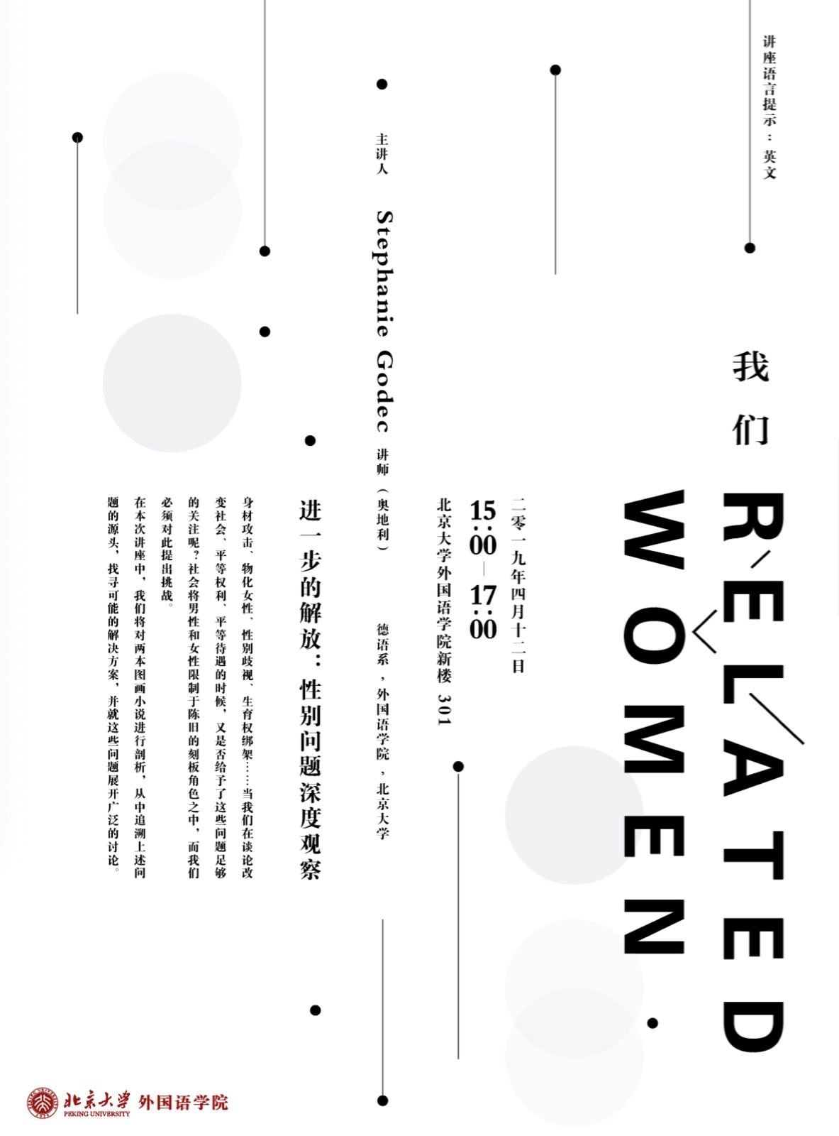 “我们-Wǒmen-Related”专题系列讲座由YAMEI.COM亚美体育(中国)科技公司德语系外籍讲师Stephanie Godec发起和策划,从女性视角出发,关注不同群体中、不同角度下的女性问题。本系列讲座规划开展三场讲座及一场主题讨论活动。2019年4月12日下午,系列第一讲在外院新楼301会议室举行,本场讲座主题为《进一步的解放:性别问题深度观察》,由发起人Stephanie Godec主讲。